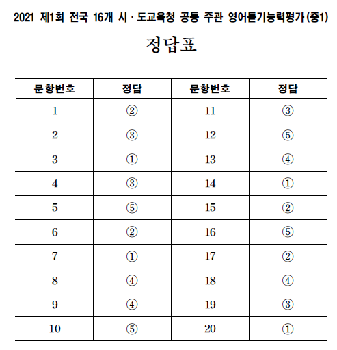 2021년, 1회, 중1영어듣기평가, 시도교육청 1회 중1영어듣기평가 시도교육청 대본 및 정답