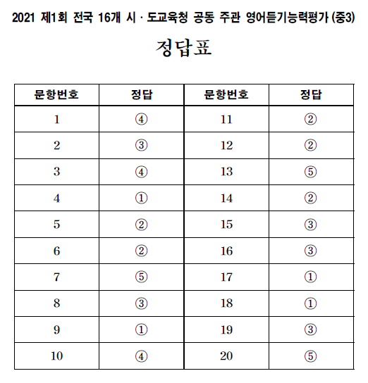 | 2020학년도 중3 제1회 전국 16개 시.도교육청 공동 주관 영어듣기능력평가 (0) | 2020.06.26 |